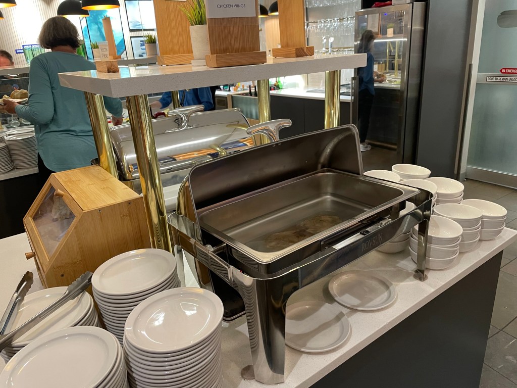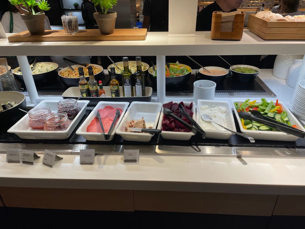 When I arrived it was only about 9AM, and the lounge was quite empty. The food was breakfast, and not particularly interesting, with yoghurt, a cold salad bar, some breads and alcoholic and non-alcoholic drinks. Around 11AM, in preparation for lunch, much of that was replaced with some rather tasty salads.