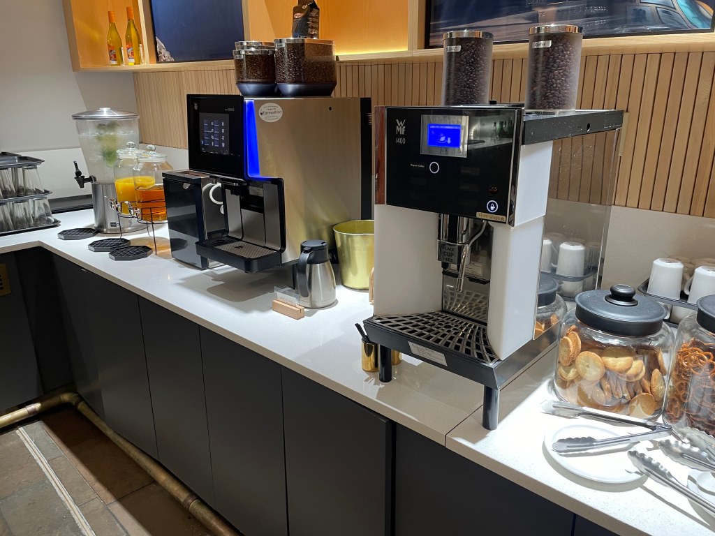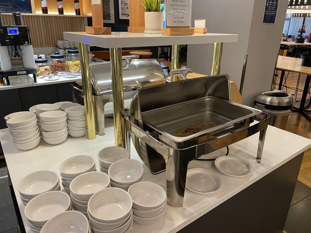 I was quite early so the lounge was probably 30% full. Entering was easy, with just a scan of my boarding pass. The lounge was airy and pleasant, though perhaps not as modern as you might expect from a lounge operated by Scandinavian airlines. Three distinct sitting areas were divided into an area with large, round tables for community-style snacking, comfortable lounge seats with side tables, as well as slightly elevated area with an elevated bench and bar-style seating. I grabbed a seat and placed my bag and coat, and checked out the buffet. Unfortunately, the food wasn’t being served yet:
