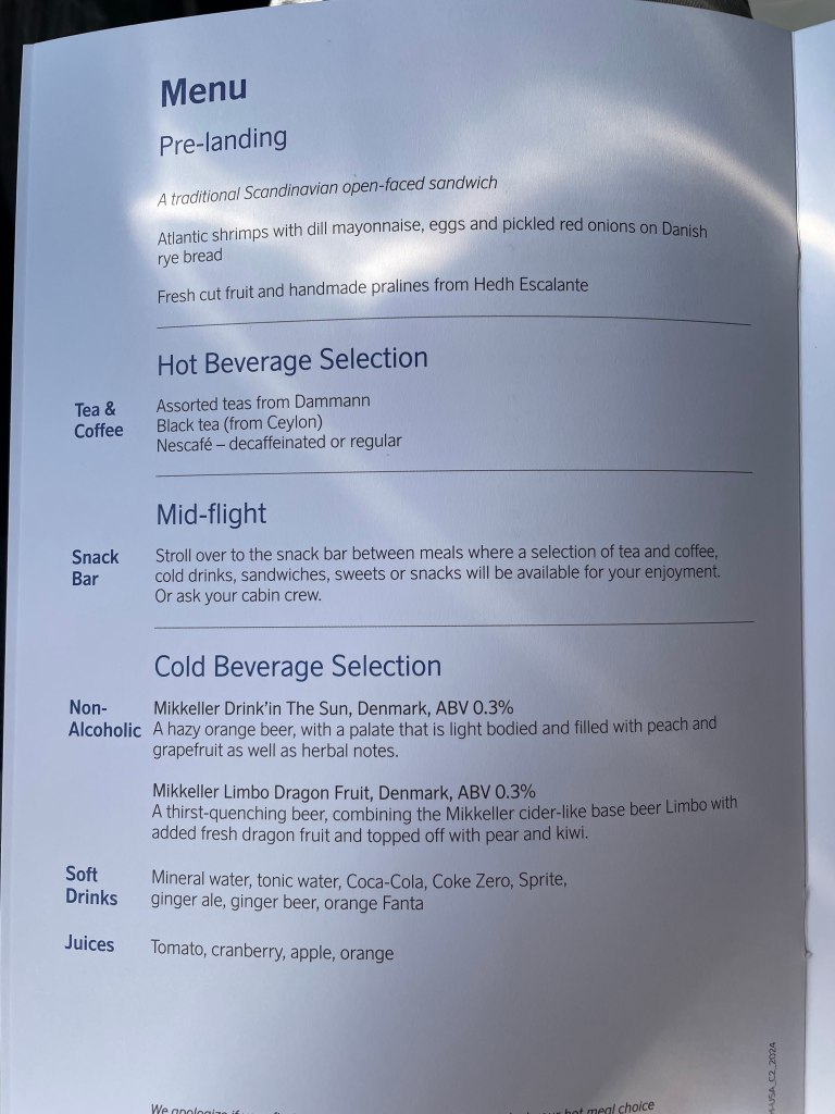 Towards the end of the flight to CPH breakfast was served, but as I had noted, I opted to skip it and ‘sleep in’, as the flight attendant had noted (perhaps ironically?). On the flight to EWR I was very excited for the open-faced sandwich that the menu promised. This was served on a single tray with a chocolate by Hedh Escalante, based in Lund, Sweden, as well as a small bowl of fruit. suffice it to say that I adore these sandwiches. This particular one was a slice of (excellent) rye bread, with on top dill mayo, egg, shrimp and sweetened onions. If that sounds strange, I agree – but it’s delicious. Please try it sometime! I conveyed my enthusiasm to the ‘chef’ flight attendant, and he seemed excited about my excitement, which made for a fun interaction!