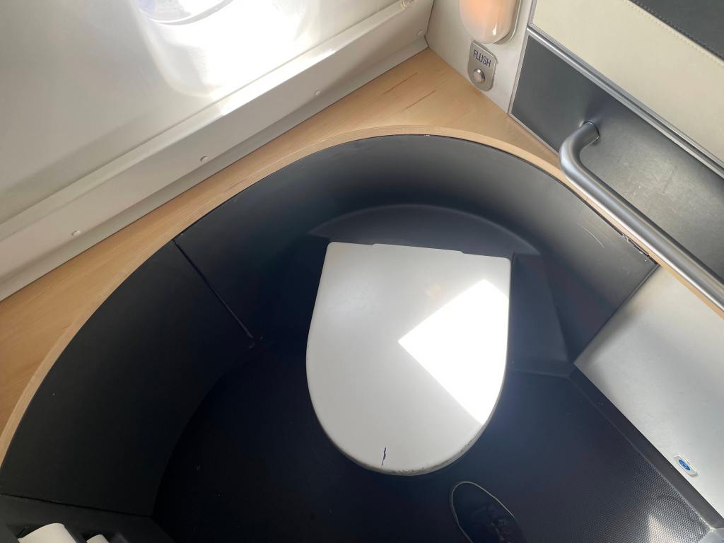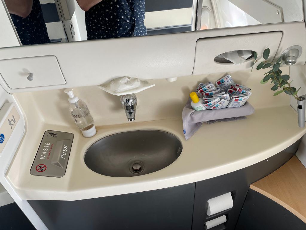 At this point it was time to check out the lavatory. There are three business class lavatories on this plane, one to the left-front, and two in the back of the business class cabin, on either side of the plane. To my surprise, SAS outfits their business class lavatories (the back ones at least) with a window! This was very nice, as it added some natural light to an otherwise dark and cramped room. The lavatory was also spacious, and the finishings were that of a wooden texture, though there wasn’t much in terms of premium amenities. The flight attendants did a good job to keep the lavatory clean until the end of flight, though.