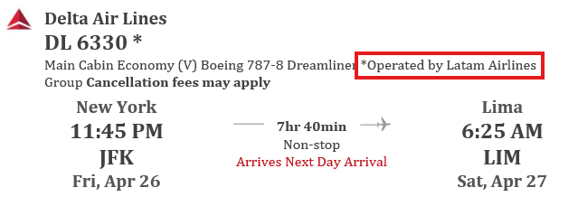 How can you recognize a codeshare? Look at the below example from a flight my husband and I booked with Delta to Lima, Peru last April: you see the Delta flight number DL6330, but it also says ‘operated by LATAM’, which is what signifies this as a codeshare. Delta is marketing the LATAM flight as if it’s a flight it operates itself, but it’s a LATAM flight. The LATAM flight number for this flight was LA2469.