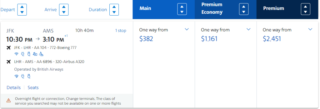 On the other hand, if you’re savy and you know your partnerships, you can also ‘manipulate’ this to your advantage. For example, American Airlines does not fly to Amsterdam, but through a codeshare agreement with British Airways, they can ‘operate to Amsterdam’ with one stop: