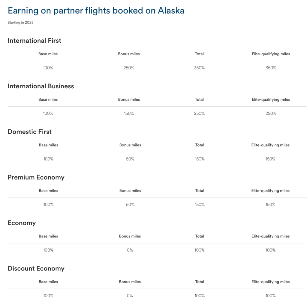 Those are some very high amounts, that can really move the needle on how quickly you can earn redemptions. Note however that this will be just on partner flights booked through Alaska. If you fly on Alaska Airlines, these are the percentages: