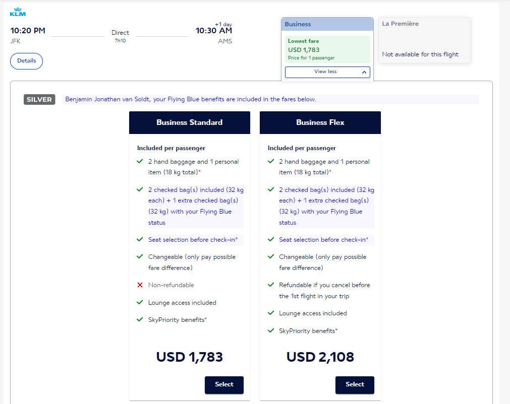 An example: flying business class from New York to Amsterdam