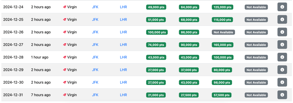 Over Christmas and New Years, prices are very high as well, as expected. Perhaps don’t expect to get good redemptions with Virgin around these busy travel periods.