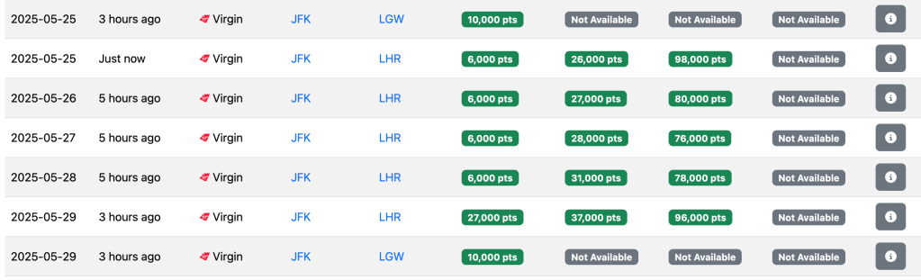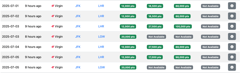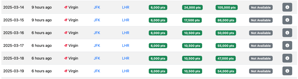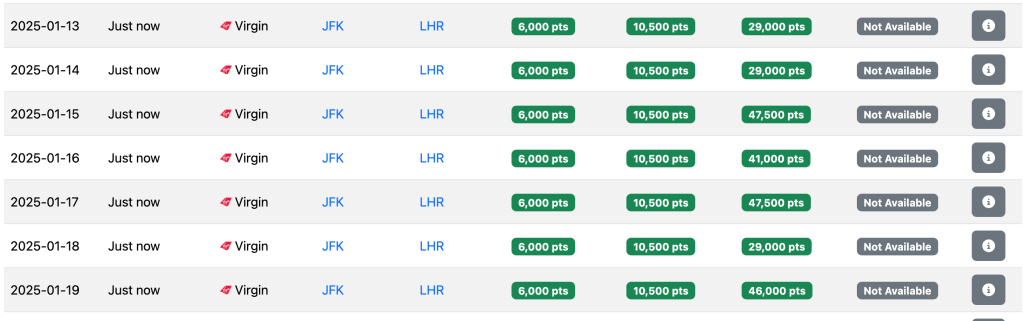 It’s also worthwhile pointing out that in the summer flights shown above, the 20,000-point flights are actually Delta-operated. The 12,000-point flights are the Virgin-operated flights. 12,000 points essentially conforms to some of the saver award flights Virgin used to have before the implementation of the dynamic pricing, meaning that overall, we do see that Virgin kept its word: the new, 6000 point saver award is actually lower than what used to be, and even in high-demand seasons as summer, prices are not necessarily higher than what they used to be, it seems.