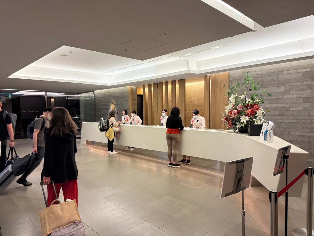 This is also the entrance for JAL’s first class lounge, which would be to the left. the Sakura lounge is to the right. You’re met with a battery of staff who will check your ticket and advise you about your boarding gate and how long it will take to walk there.