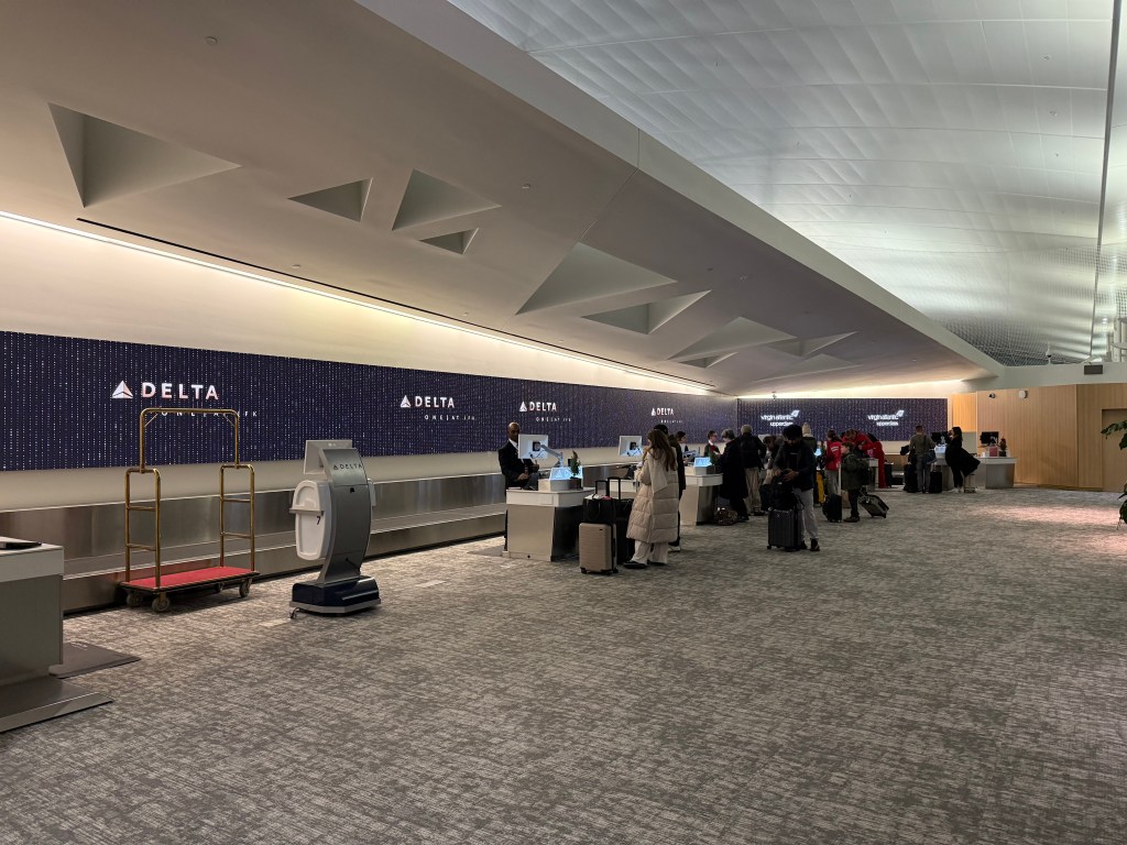 Except I now understand that Delta One is not just a lounge: it’s a whole pre-departure experience, at least at New York-JFK’s Terminal 4, which is where my flight originated. With SkyTeam alliance member airlines, those in premium economy and up receive priority services, dubbed ‘SkyPriority’. At JFK’s Terminal 4, those services all the way on the western edge of the checkin hall. Here, I was quickly shown to a special entramnce for Delta One passengers…