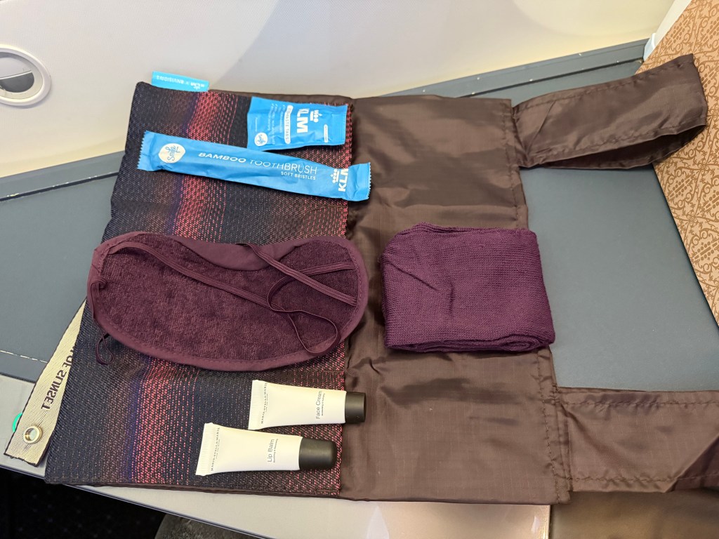 In terms of amenities, when you get to your seat you’ll find the menu, a bottle of water, noise-canceling headphones, and an amenity kit. To start with the latter, I thought it was actually cute. It unravels to become a reusable bag with some side pockets, and holds lip balm, face cream, toothpaste, a tooth brush, socks and an eye mask. So, a little basic but nice nonetheless and adequate for this transatlantic flight.