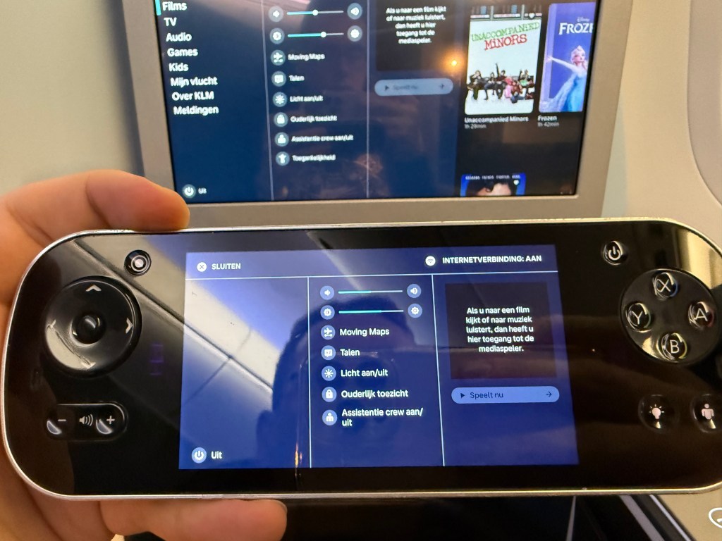 There are three buttons along the seat’s right armrest that control seat position, and they are basically upright, lounge and full flat. You can stop anywhere in-between those positions, but you can’t seem to control the separate parts of the seat independently (e.g. just the footrest). After dinner I went into bed mode to catch some shuteye, which was easy to setup, and was actually rather comfortable, also thanks to the surprisingly substantial pillow that KLM provides.