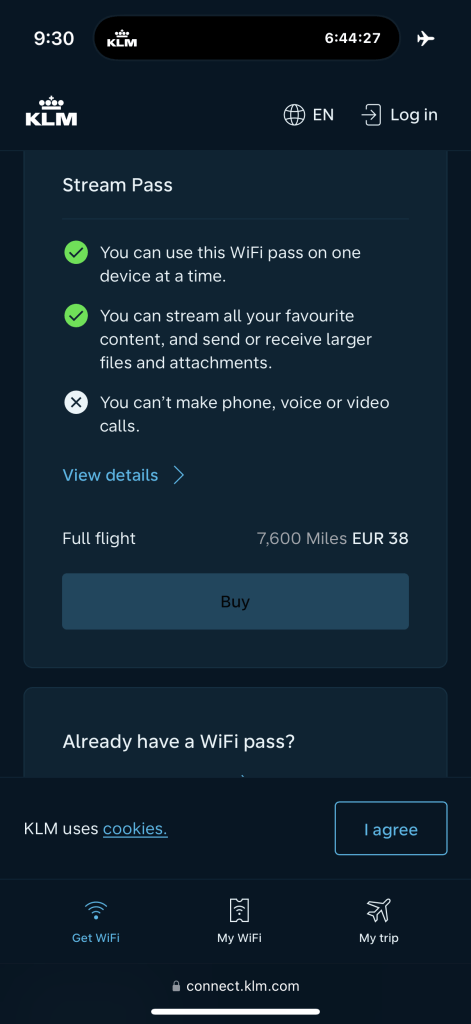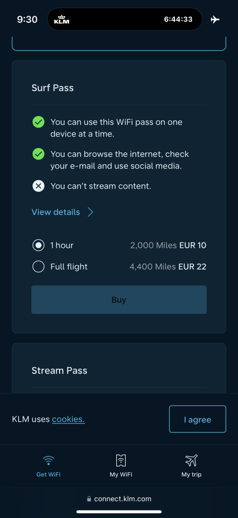 In terms of Wifi, there does not appear to be a special business class pass, rather you have to buy access, which I thought was a little disappointing. That is, messaging is free, while the surf or stream pass are paid, costing up to 38 Euros for the full flight. I’d had hoped that KLM would provide the surf pass free of charge for business class passengers.