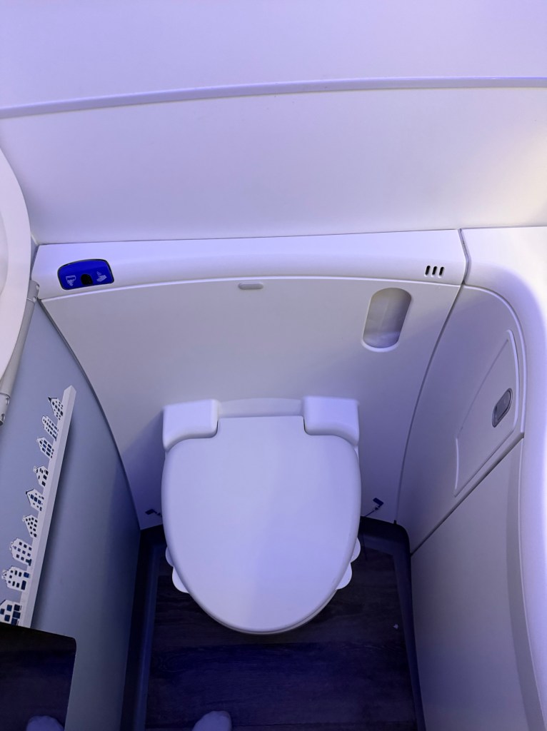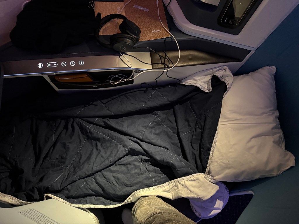 One more thought, and I know this is a hot take: I kind of liked that the privacy panel was on the smaller side and there was no door. Don’t get me wrong: for long flights such as on JAL’s A350, I find that privacy is important to allow for a good night’s sleep. However, on this short flight, the added flexibility that not having a door allows becomes a boon. Why? Because with this particular seat design, it’s easy to slide out from under the tray table during dinner to go to the lavatory. It’s also easy to scoot out in bed mode, or to setup the bed. At the same time, the privacy panel that is available is enough to allow for privacy around your head when you want to sleep. Again, flight length is an important factor, and long flights, such as Amsterrdam to Johannesburg, may not be as nice, if you want to sleep for longer periods of time.