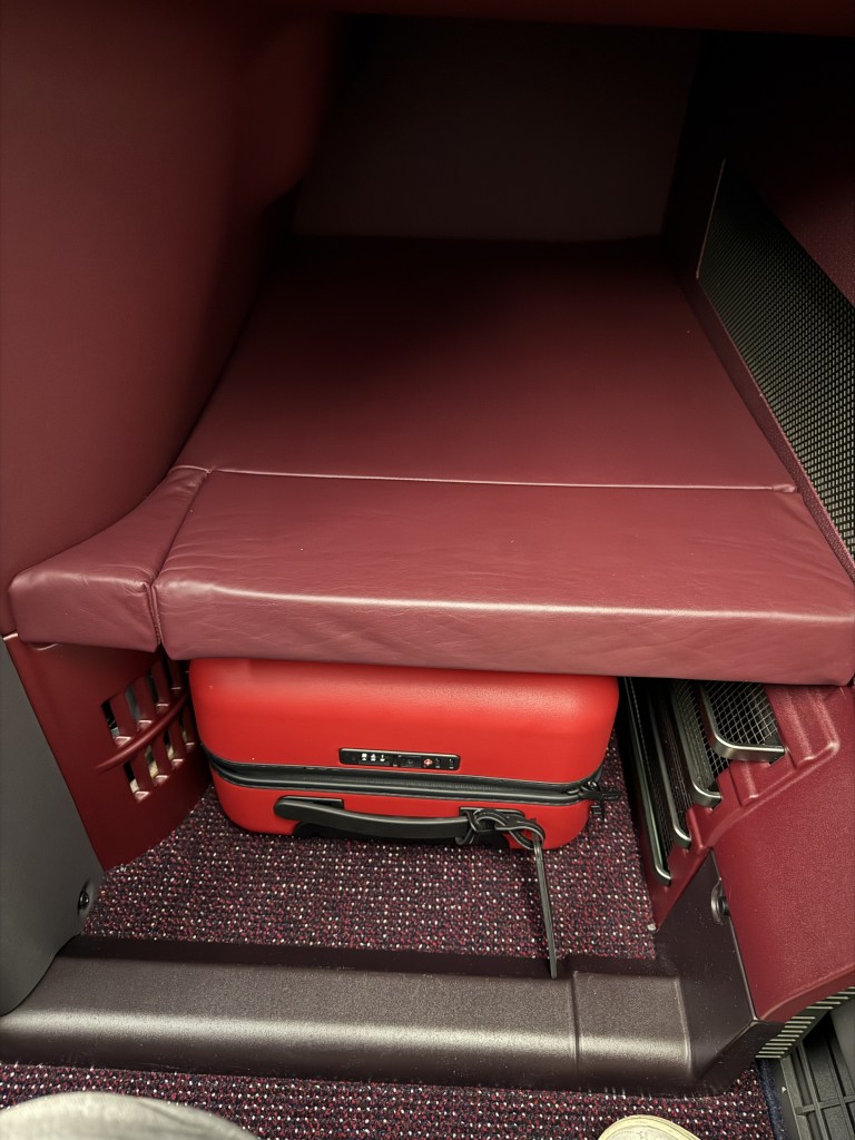 Then, you might want to put your jacket in the wardrobe, which includes a coat hanger. The wardrobe slides closed and this will also reveal the full extent of the entertainment screen. One thing to note is that the wardrobe must be closed for the seat to go into anything but upright mode, as the wardrobe door will block the movement. There is also a drawer of sorts where you can place your shoes. This probably seems like a detail, and it’s certainly not something that will make or break a flight. That said, having your shoes securely stowed and not lying around your suite made a difference to my experience (but, I’m a stickler for organization).