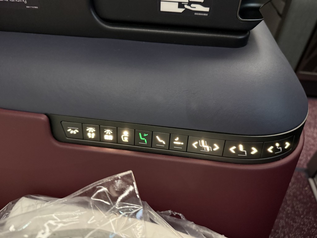 Beneath the console are the seat controls, which are largely intuitive. There are preset buttons that will allow you to go into upright, lounge and flat modes by pressing and holding them, but you can also control different parts of the seat independently. This includes buttons for moving the entire seat back and forth (for dinner, for example), as well as the backrest and footrest. Then there’s also buttons to control the different lights, such as the overhead light and the reading light. There’s also a crew call button.
