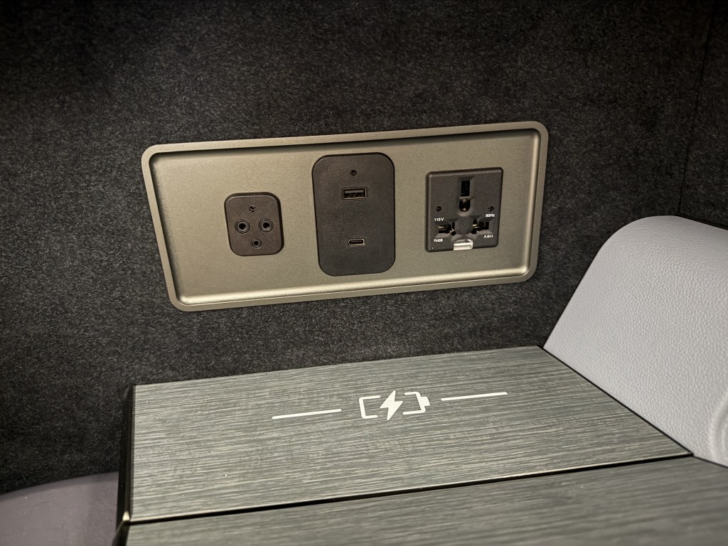 In terms of charging, this seat does have some cool technologies. At the back of the console there are the usual universal charger sockets, but there are also a USB-A and USB-C plugs, and the headphone jack is here as well. Finally, there is a wireless charging option, as shown with the ‘charging battery’ symbol on the console’s surface, just below the sockets. Though I’ll add this did not work all that well for me. I tried this later while in flight, and found that I had to take my phone out of its case for adequate contact, and even then I had to lay my phone rather precisely. It’s easy to imagine how during turbulence your phone will move around and may stop charging. So, to me, the wireless charing seemed more of a gimmick than truly useful charing option, and I reverted to using wired charing. Thankfully, I was able to charge my laptop, phone and watch all at the same time due to the various different sockets and plugs available.
