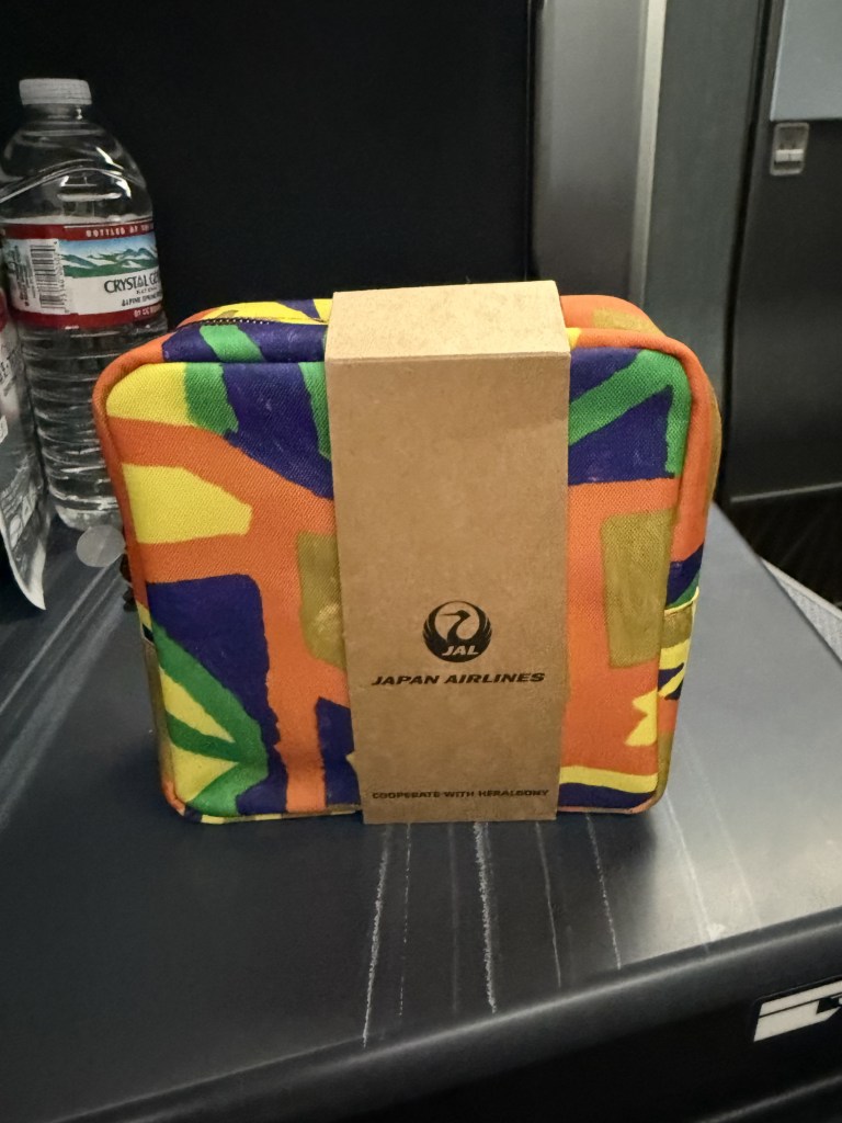Next up, the amenity kit comes in the form of a lovely, colorful pouch. I spied different design at various seats, so I believe there are at least three or four variations in all. While the size of the pouch is a little small, it’s packet with some interesting stuff: