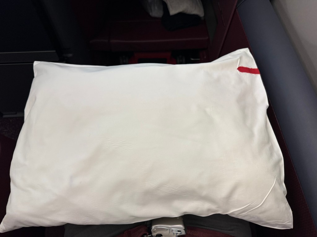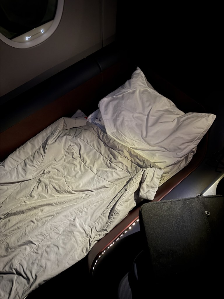 I made my bed, but stupidly I did not realize that you can be provide with an actual mattress. This was not proactively offered and I didn’t think to ask, since a light, blanket-like cover was offered, so I thought that was all that would be provided. It’s only on my flight to Boston that I realized that the mattress pad can be provided, so keep this in mind when you fly JAL!