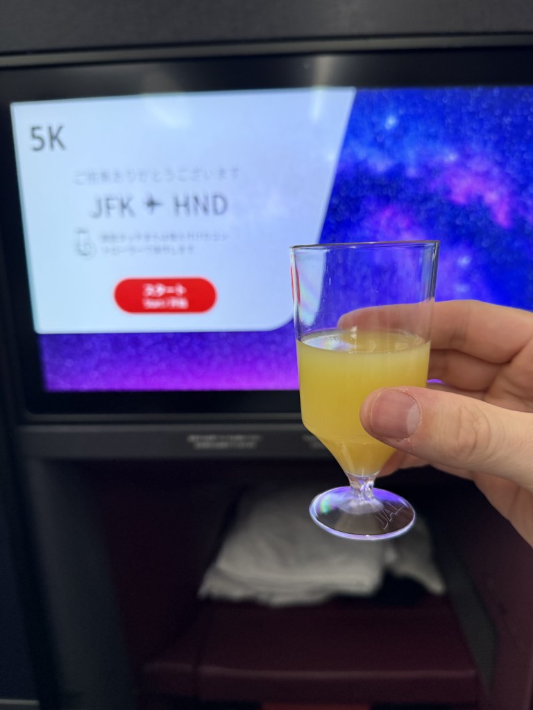 Next, a junior flight attendant passed by with a tray with pre-departure drinks. My understanding is that for a while JAL did not do this, so it was nice to receive a drink, in proper glassware. I chose some juice.