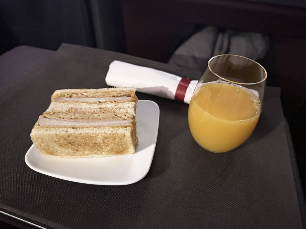I ended up choosing the Pork Cutlet Sandwich and orange juice, which was brought to me about 5 minutes later, heated up. It was quite delicious, and was enough to sustain me until dinner.