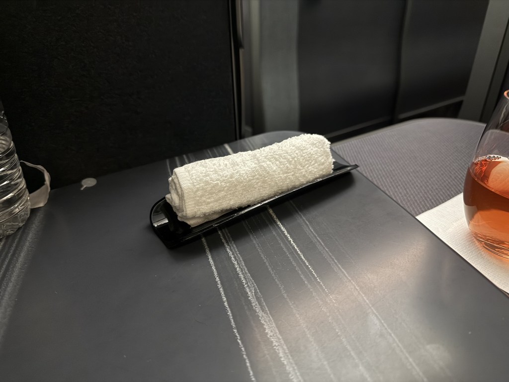 I sneakily asked for a drink before dinner service and while the flight attendant initially asked if I was okay waiting for meal service to ramp up, she ultimately brought me my order: JAL’s SkyTime drink, which I quickly became a fan of. A hot towel was provided shortly after, to wash your hands:
