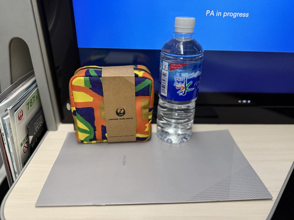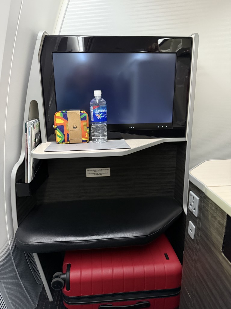 Waiting on my seat were a pillow, blanket, slippers and noise canceling headphones. Sitting down, there was a lot of space for my legs. The carryon fits under the ottoman in front, which is a feature I really like. I personally like having the carryon with me so that when I need t grab something I don’t need to get out of the seat. Then, on the little table at the entertainment screen waited a menu, a bottle of water and the amenity kit. Although I saw a bunch of different designs, I suppose I ended up getting the exact same one that I got on my flight to Tokyo. Other than that there was a literature pocket to the left of the screen, and there was a narrow shelf to the right of the seat.
