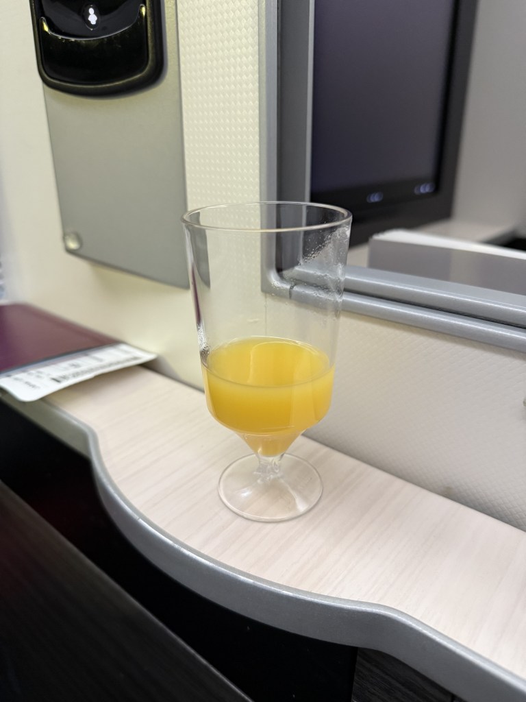 Soon enough the flight attendant came by offering a pre-departure drink in glassware, with a choice of juice, water and champagne. I decided to have some juice, as too much alcohol detracts from my sleep on planes (somewhat ironically, since in economy I’d actually drink more to sleep – in business I find I get too hot and can’t sleep). Note that I made the below pictrue after having a few sips already… I assure you they weren’t stingy with the portion!