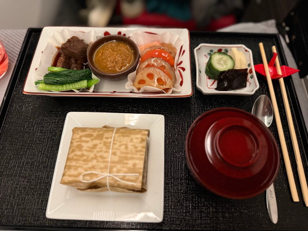 Soon the crew came by to start dinner service. First the purser came by to introduce herself and confirm that I had chosen the Washoku meal, the traditional Japanese cuisine. Then, another flight attendant came by to bring a hot towel, which was nice and refreshing. I then sped to the lavatory to quickly change into my pajames, which I had put in my carryon as I had done on the flight to Tokyo.