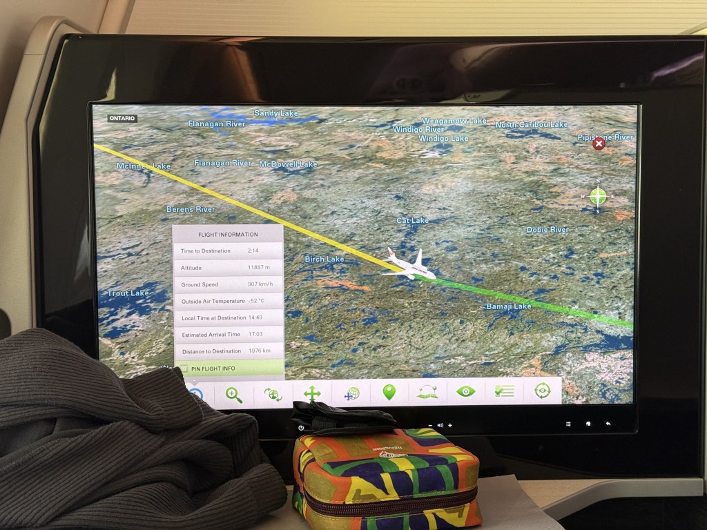 After I woke up, I must have slumbered for a while longer, but I realized I had forgotten to dim my windows as the light of dawn started to peek through. It wouldn’t last for all that long given that we were supposed to arrive in Boston at 5pm, at which point it would be past sunset already over there. That said, the cabin lights were turned on, and it was announced that lasts service would be provided. This was about 2 hours before arrival, and we were flying over Ontario at the time.