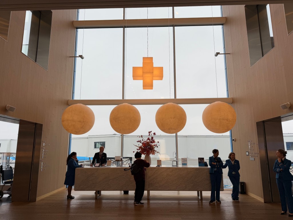 At a different time, the windows behind the desk would offer a beautiful view of the apron, but alas, a long connector that allows passengers to cross from one pier to another is blocking the view.