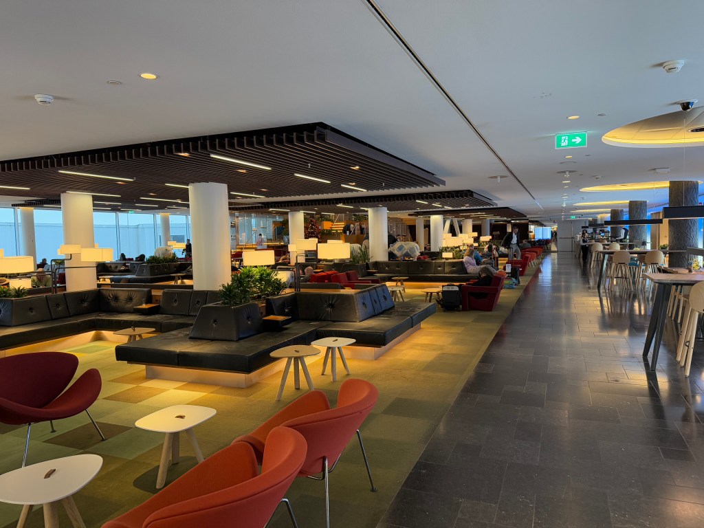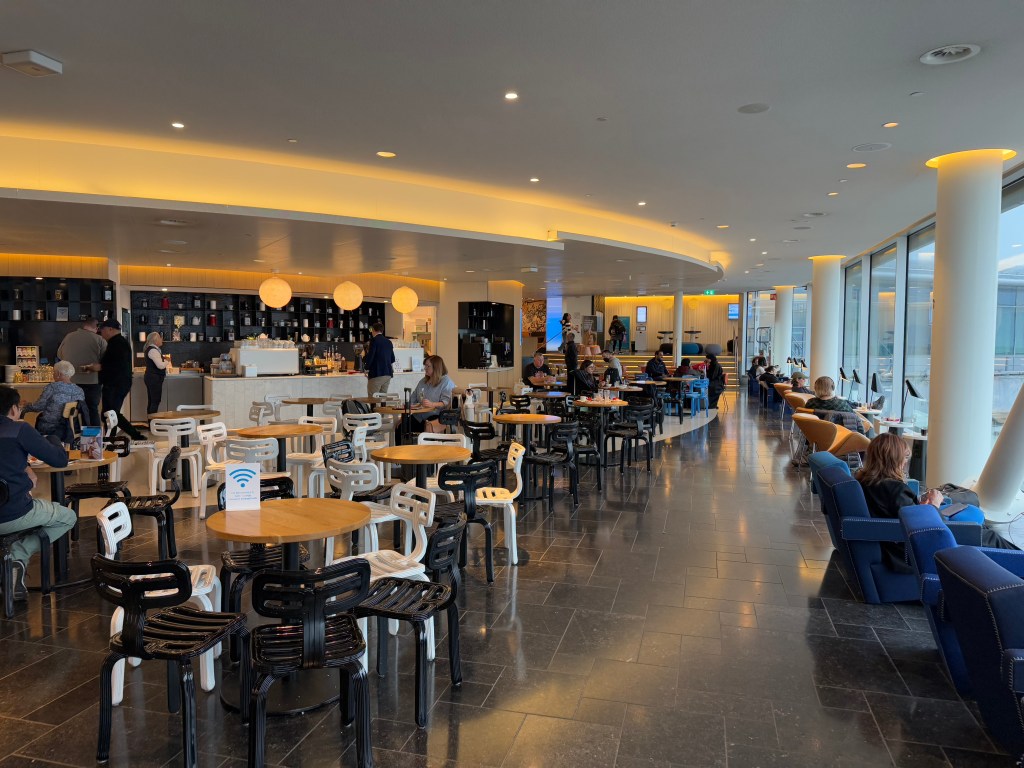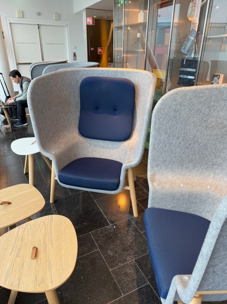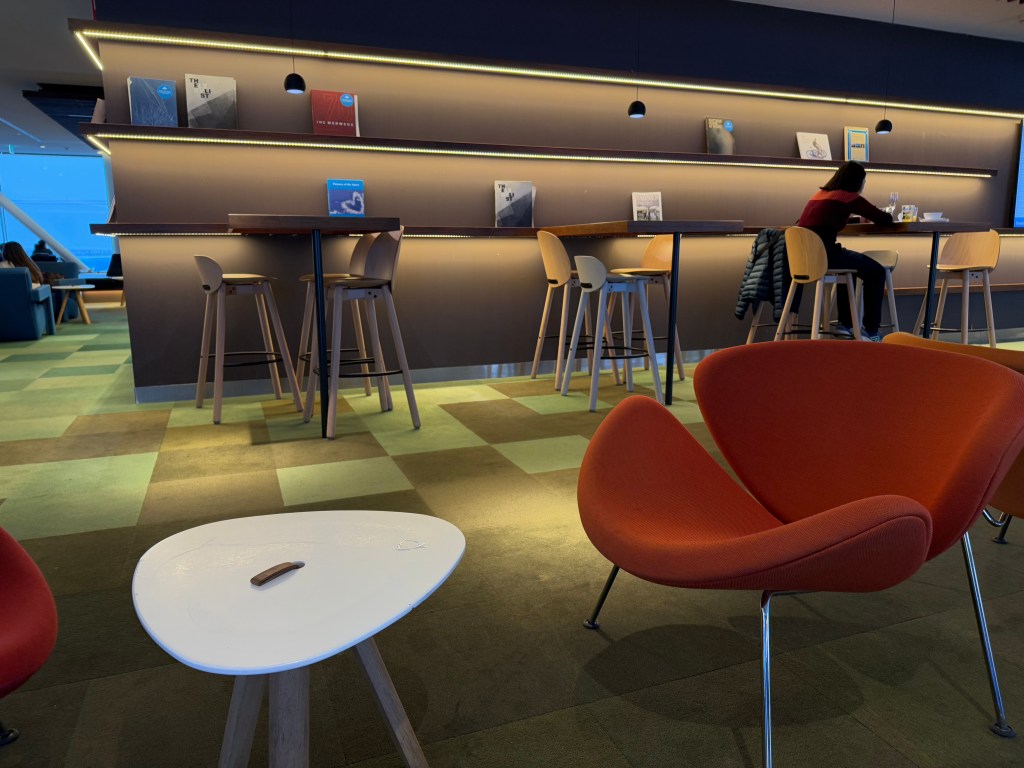 Going deeper into the lounge, there was a circular area of sorts that was home to most of the food and drink stations on this floor of the lounge. I’ll go into the actual offerings in the next section and will focus on the seating here. For example, there was a cafe area with an actual barista, with long, communal tables, perfect for larger groups, as well as smaller tables for couples or small groups alike. The seats didn’t look particularly comfortable to me. Their design is also… well, I would call this an example of Dutch design (and I say this as a Dutchman) that attempt to be ‘different’ and ‘modern’, but ends up being… quirky?