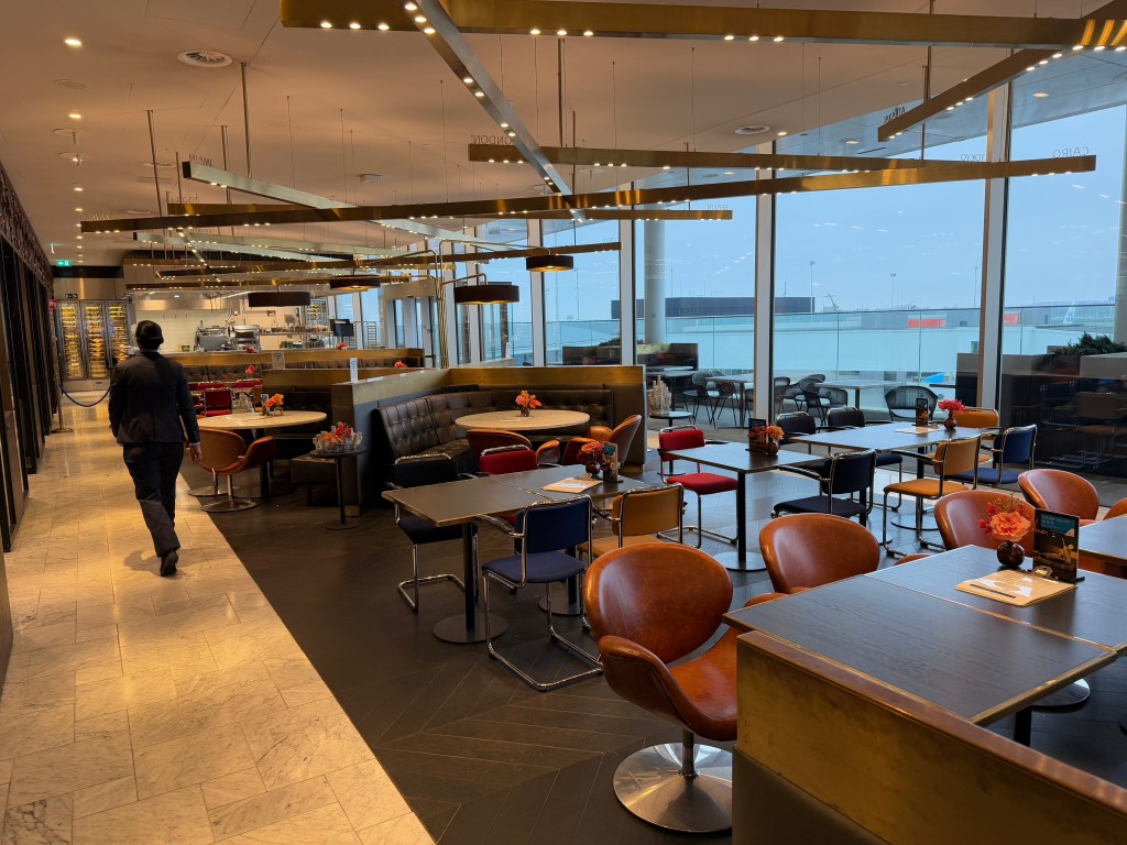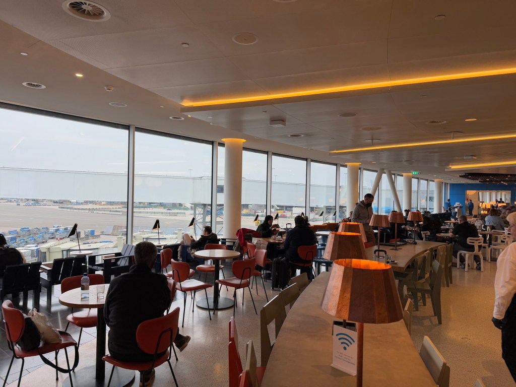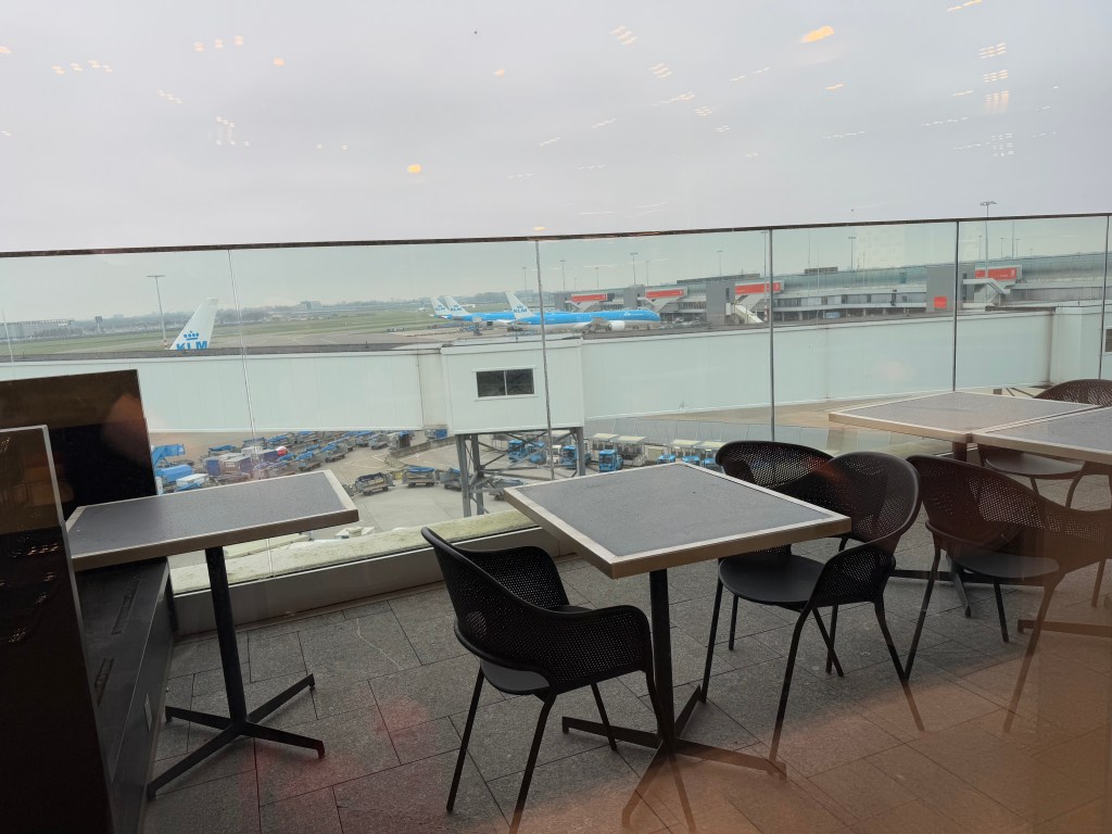 Overall, I enjoyed my time in the KLM Crown lounge 52. It’s a massive lounge with plenty of different kinds of seating, from couches, to dining, to lounging, to working, wiht various levels of privacy (and comfort). Overall I thought the variety of ‘vibes’ was kind of impressive, and I particularly liked the top floor, with the outdoor viewing deck, with beautiful views of the apron (if not blocked due to construction…). I also liked that there are some additional amenities (as a hub lounge honestly should have), such as nice-looking showers, a spa and rooms to sleep. Though, the latter two are (unfortunately) at a fee.