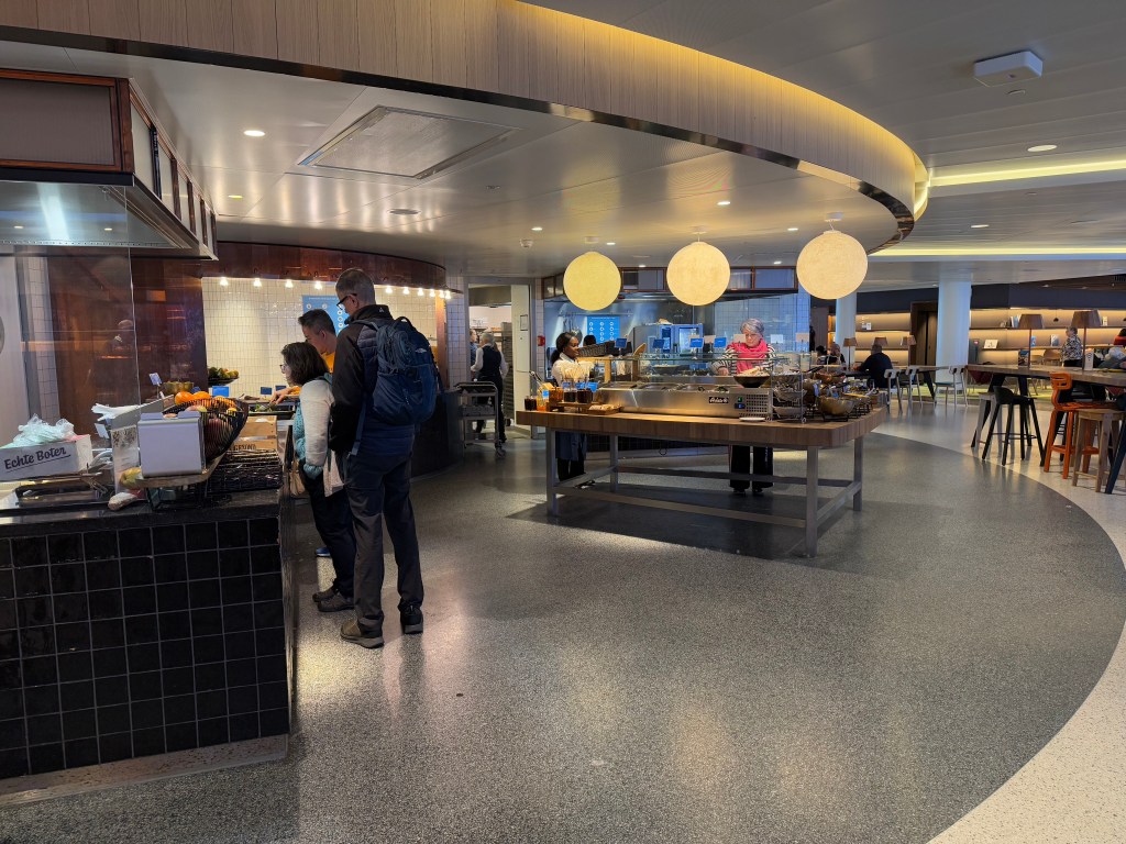 I’ll cover the wellness facilities later on. So, continuing back to the food area, had we rurned left, we’d reached the first of two bars, branded by the famous Dutch beer brand Heineken. There are various kinds of seating here, predominantly hightop seating, and restaurant style seating on two levels. Both levels feature couches with medium-sized tables and chairs. The upper level’s seating is similar to what’s on the lower level, but with larger tables it’s better for larger groups, and being on the upper level it also feels a buit more private.