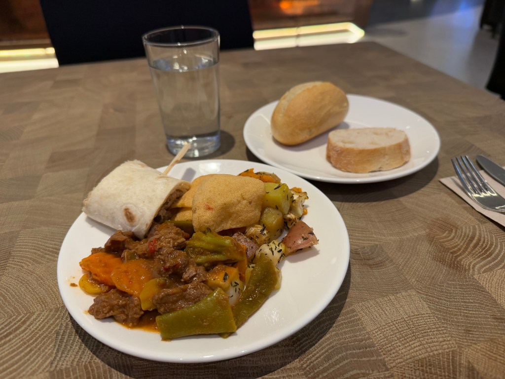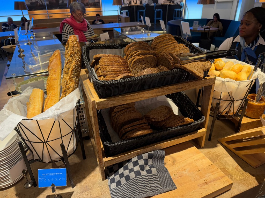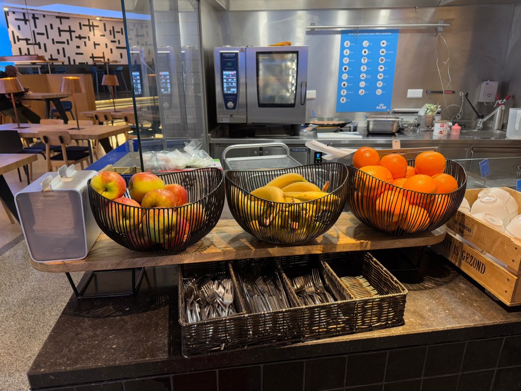 You probably wouldn’t fall of your chair with surprise, but I reckon you’ll find something tasty to eat to hold you over until the flight. If I did have to make on comment, it is that the presentation was sometimes a little sloppy, with name cards that had fallen over, some leftovers that hadn’t been cleaned up properly, and presenting foods in their baking trays. Still, I was more than happy with the food I had. And when I came for a second round, the staff had put out a tray with so-called ‘Appel flappen’ (which may be Apple turnovers in English?). The Dutch traditionally eat those around New Year’s Eve, so it was cool to see that those were offered to the guests at the lounge!