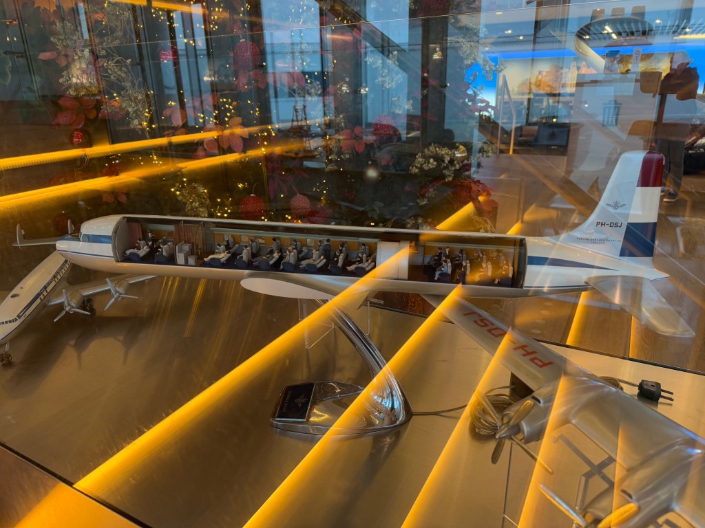 As you ascend these stairs, you’ll find booths and various benches, and I especially enjoyed the various models of KLM planes, going back to their first propeller aircraft back in the day, all the way up to today’s Boeing 787s.