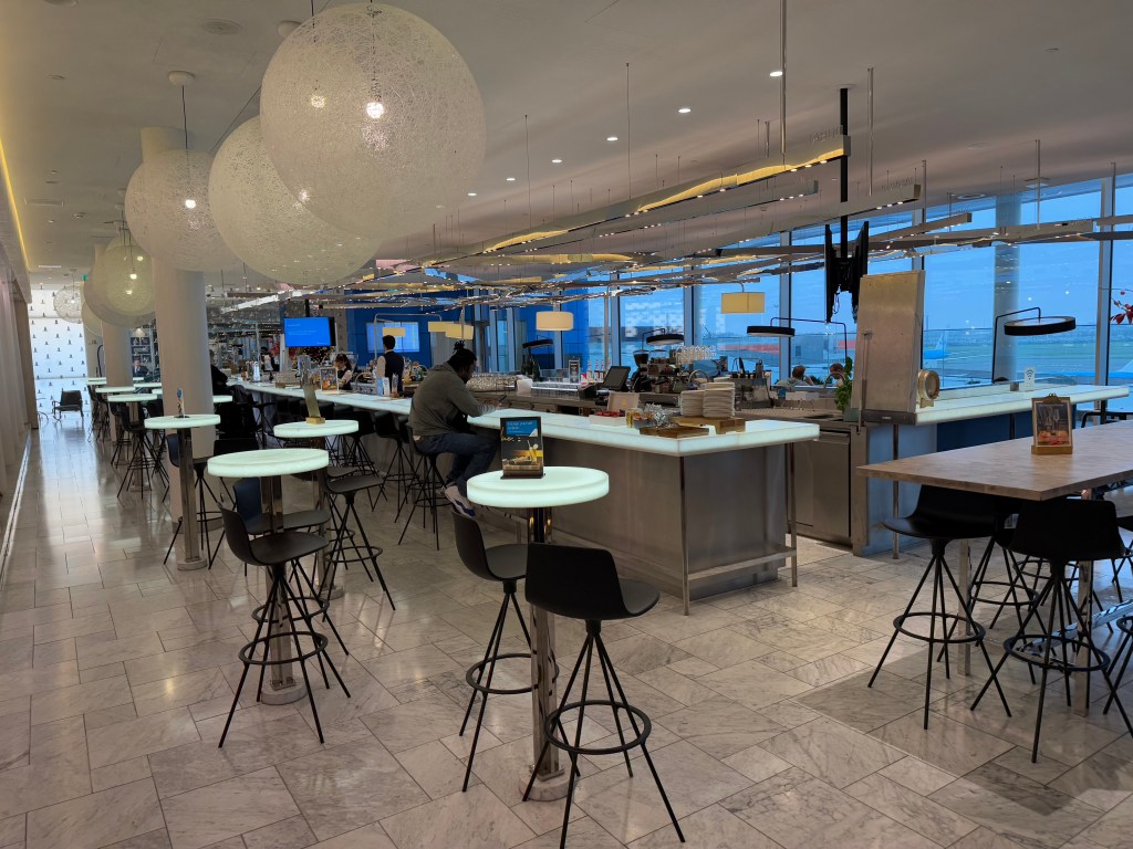 As mentioned before, on the second floor there is something of a restaurant with plenty of true restaurant seating, but with a menu that’s more ‘bar’ than ‘restaurant’. Unfortunately, none of this is complimentary and the prices are indeed rather restaurant-y (in cash or miles), which surprised me a little. After all, you’re already here, flying business class. It’s also a striking difference with the Delta One Lounge dining experience on my way to Amsterdam, where great food was all complimentary in a beautiful, true sit-down restaurant style with the appropriate service.