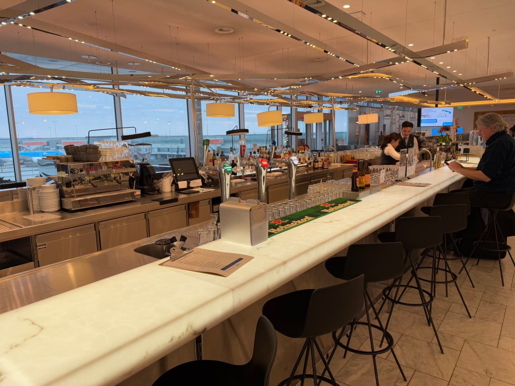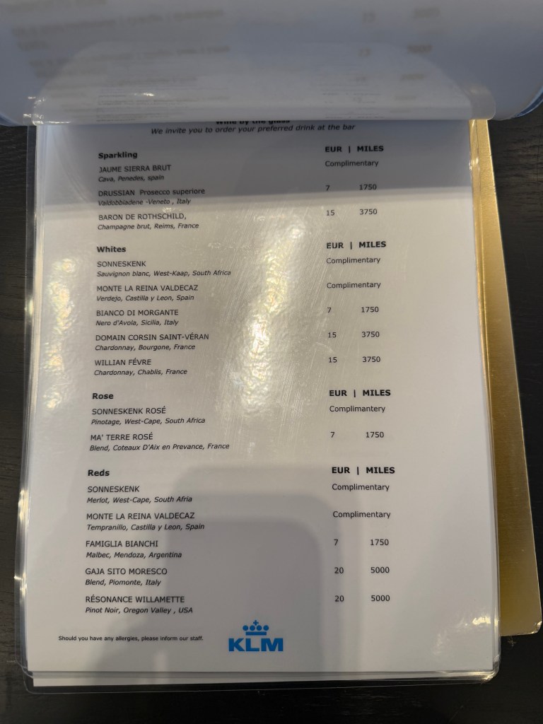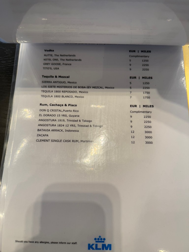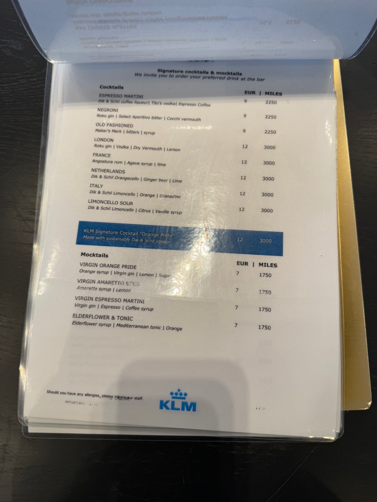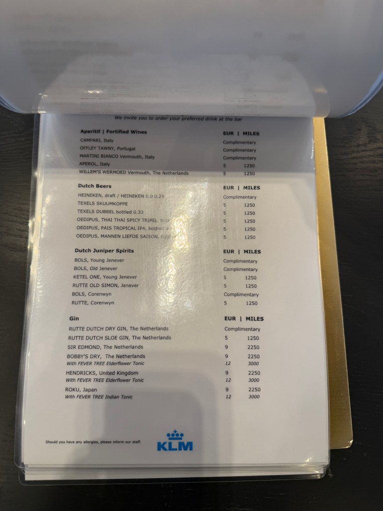 Finally, there’s two actual bars at the lounge. One is on the lower floor, and mostly seem to offer Heineken beer, and the second one is on the upper floor, and offers a wide selection of drinks. As you might expect by now, most offerings are at a fee, in cash or miles, with only the ‘basic’ stuff being complimentary. For example, Heineken bee ris free, while the much better local Dutch beer ‘Texels’ is 5 Euro a glass, at the time of my visit.