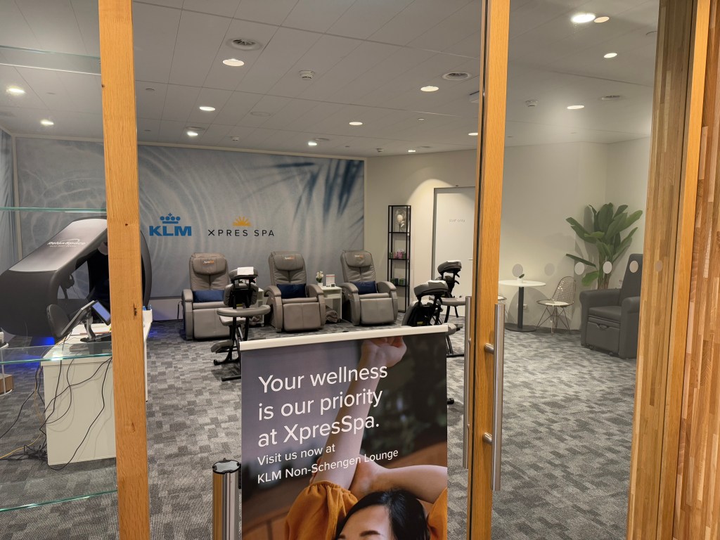 The KLM Crown lounge 52 has a variety of additional amenities, of the sort that you’d expect at an airline’s ‘flagship’ lounge. These include sleeping rooms and showers, and the KLM Crown Lounge also has a spa, where you can get paid treatments. All of these facilities can be reserved in advance through KLM’s website, as well as at the lounge itself. For this you’d walk to the very back of the lounge, where these facilities are located.