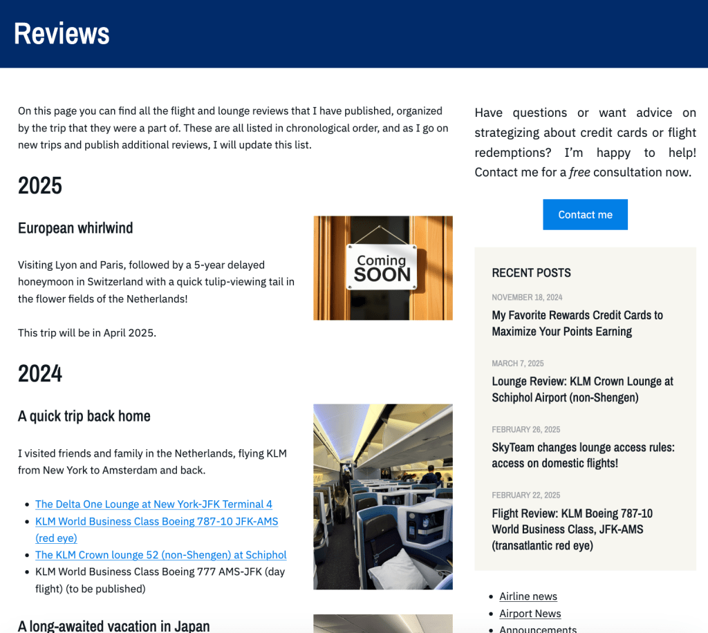 If you click on the ‘REVIEWS’ link, you will now be brought to a new page. The main content of the page has the year, followed by a list of the trips that I took (e.g. ‘A long-awaited vacation to Japan’), followed by a short description and links to the various reviews that I wrote as part of that trip.