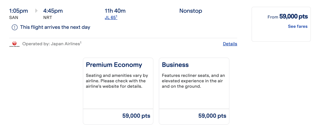 - The cheapest business class fare is at 59.000 points one way plus up to $100 in taxes, depending on the origin, from various West Coast airports to Tokyo. For example, Seattle or San Diego to Tokyo-Narita. This is not a bad redemption at all!