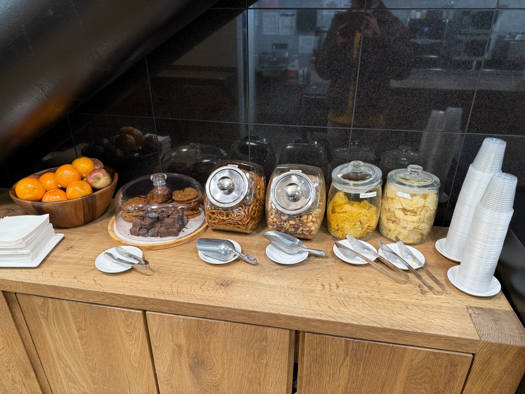 Most of the food in the lounge is actually ordered through a digital interface, rather than being freely available in the buffet. The buffet itself was very limited, with a station that had various kinds of snacks, such as chips, cookies and brownies, and some fruit: