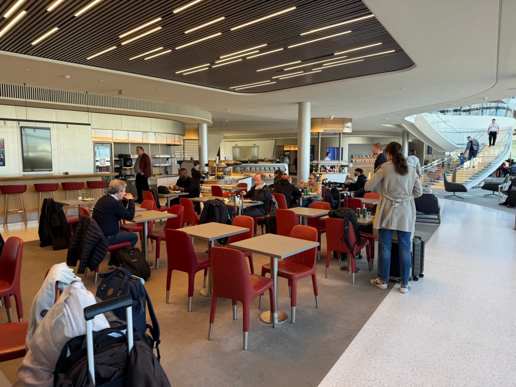 On the far end of this ‘arm’ of the T is something of a bistro counter. I got the impression that you could order some light foods, though I didn’t see an actual menu. People seemed to mostly order various drinks. While I was here (at around 11AM) there was nobody actually sitting at the counter though, but people were sitting over at the tabes. The tables on the other side of the counter are along a range of windows that give lovely views of the tarmac.