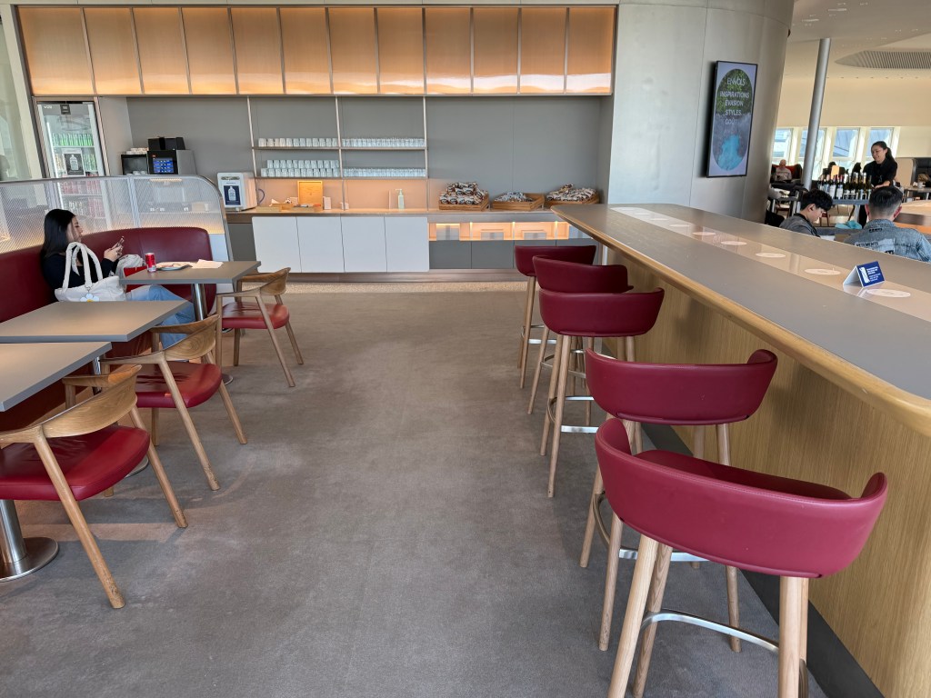 A little deeper into this part of the lounge is more restaurant-style seating with regular tables and chairs, but also a communal counter with high-top chairs.