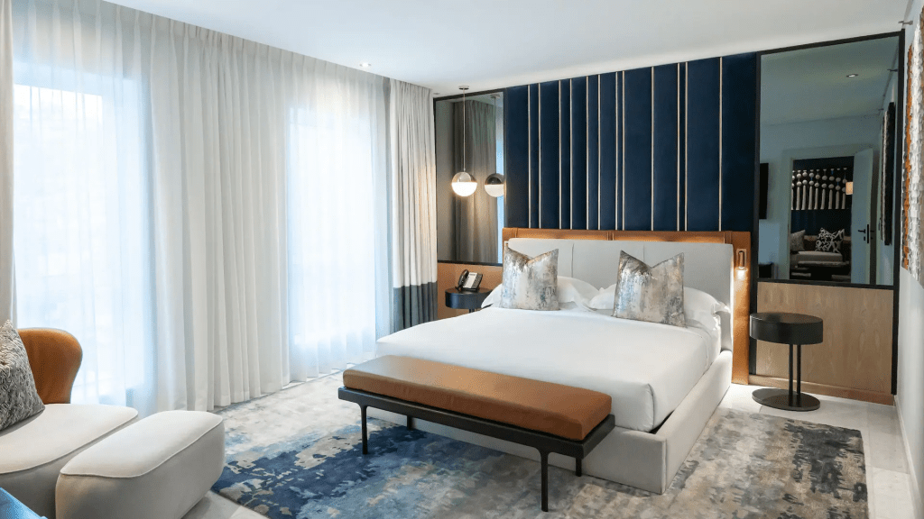 This hotel has a number of standard rooms as well as larger, luxury suits. The normal rooms start at a generous 38 square meters, with the suites being even larger. Given the height of the hotel, if you’re towards the back you’ll have beautiful views of Signal Hill and Lion’s Head. All rooms appear to have a king-size bed and the usual amenities, such as an ensuite bathroom, desk, comfortable seating and such. Interiors are modern and despite the blue color pattern appear warm and welcoming.