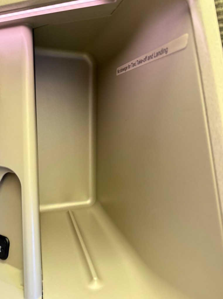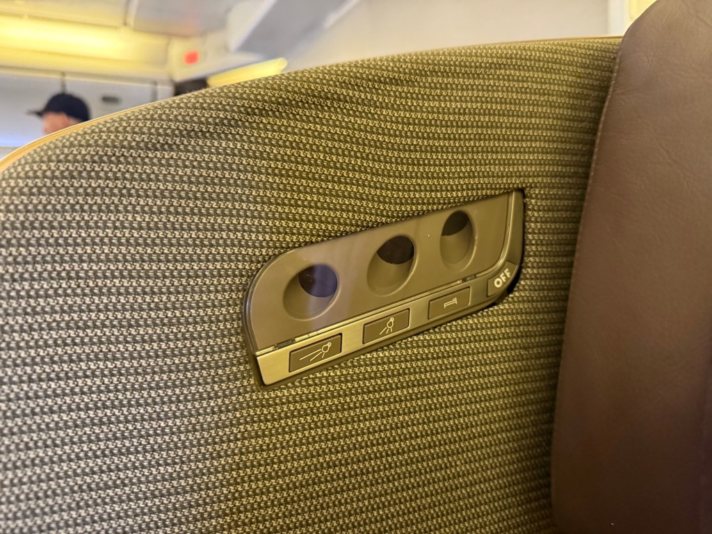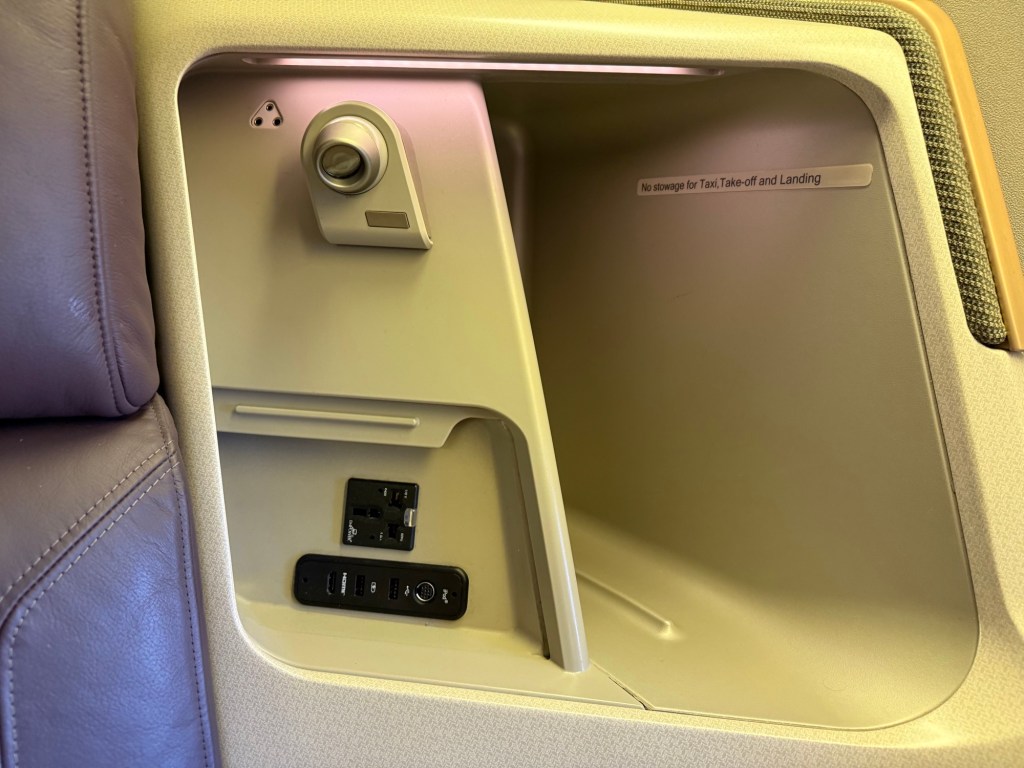 Just to the left (or right, depending what seat you’re in), is a spotlight for reading, power and USB outlets, and a fairly large storage compartment. The plugs are a great reminder of how old this seat actually is! Besides the universal power plug, there are a serial port for an iPod (which I haven’t sene in over 10 years), what looks like two USB-A ports but one is specifically for charging a device, and there is a HDMI port as well. Who these days carries a HDMI cable with them though…?