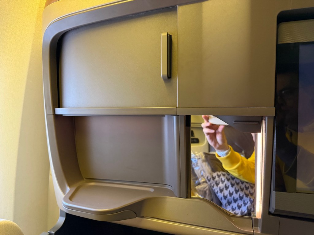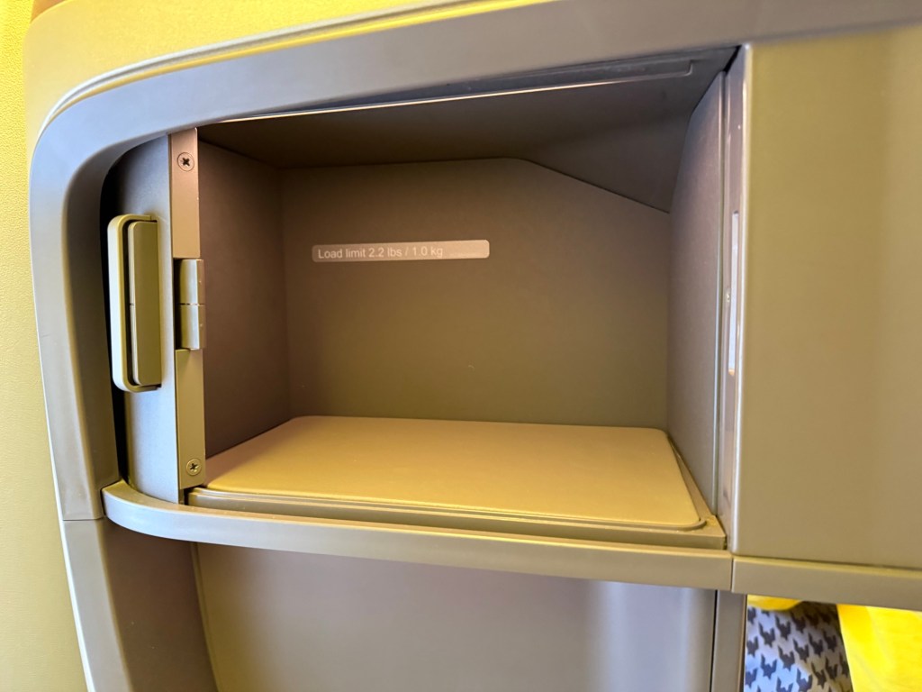 Despite the slightly odd configuration, first impressions of the seat itself were fantastic. The sheer size of the seat is the first thing I noticed. The seating surface and backrest are significantly wider than other business class seats I’ve had the pleasure of trying so far. This may come at a bit of expense to the amount of storage at the seat, though, with there being an open, deep shelf to the left (or right) of the headrest, and then a deep compartment in the armrest. There’s also a smaller compartment, perhaps good for personal items, such as phone wallet, beside the entertainment screen.