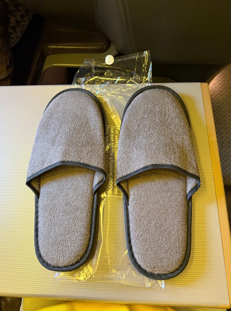One final tidbit of exemplary service occurred here: I had gotten very excited about the Singapore Airlines’ slippers, since they actually fit my foot and were padded, so they were the most comfortable airline slippers I had received so far. I asked Rianna if I could take them with me.She replied that yes of course, but suggested she could give me a fresh pair and immediately disappeared to the galley to fetch me an unopened pair. How wonderful – thanks Rianna!