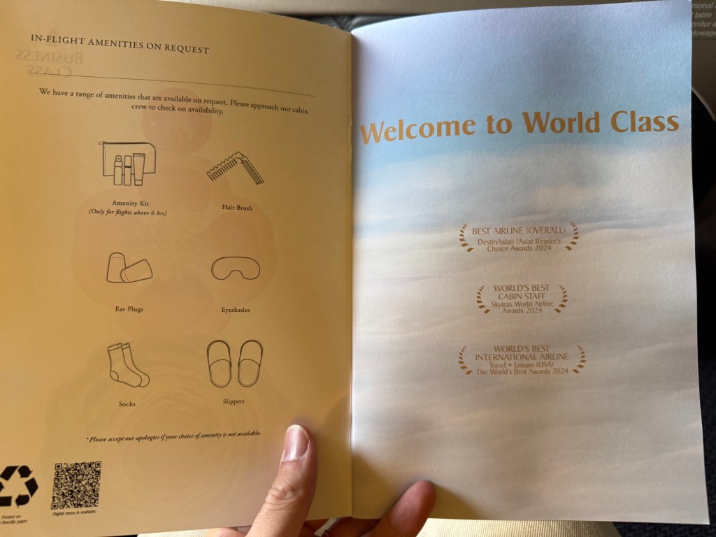 - Singapore Airlines’ extensive selection of business class amenities