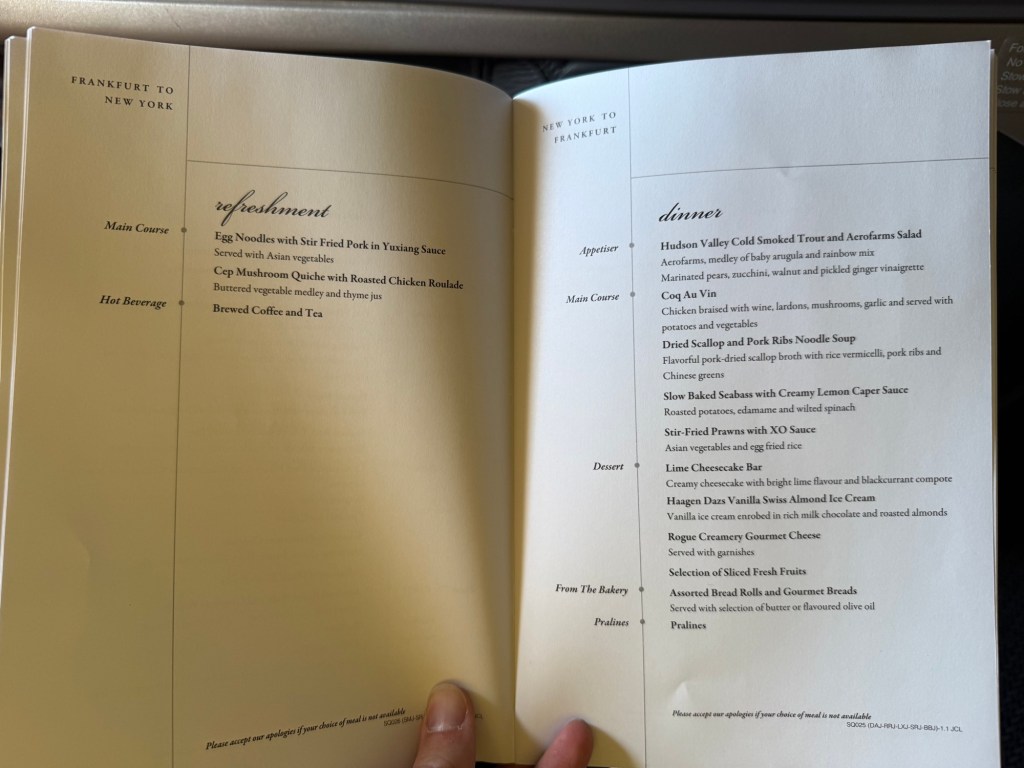 The menus had been distributed on the ground, and I had the opportunity to look through them at that time, but, here they are below. Interestingly, the menu comprised the meals and snacks available for the entire itinerary of the plane, not so much my flight on it. Meaning, I was able to take a look at the meals for the flights from Singapore to Frankfurt, Frankfurt to New York, and then new York to Frankfurt, and Frankfurt to Singapore. What struck me was that for the inbound and outbound flights between Singapore and Frankfurt, there was an a la cart ‘delectables’ menu, allowing the anytime ordering of those foods. This included noodle soups and sandwiches, mostly, as well as handful of different snacks, such as chocolate bars and pastries.
