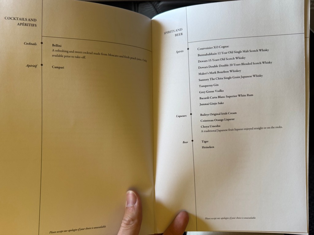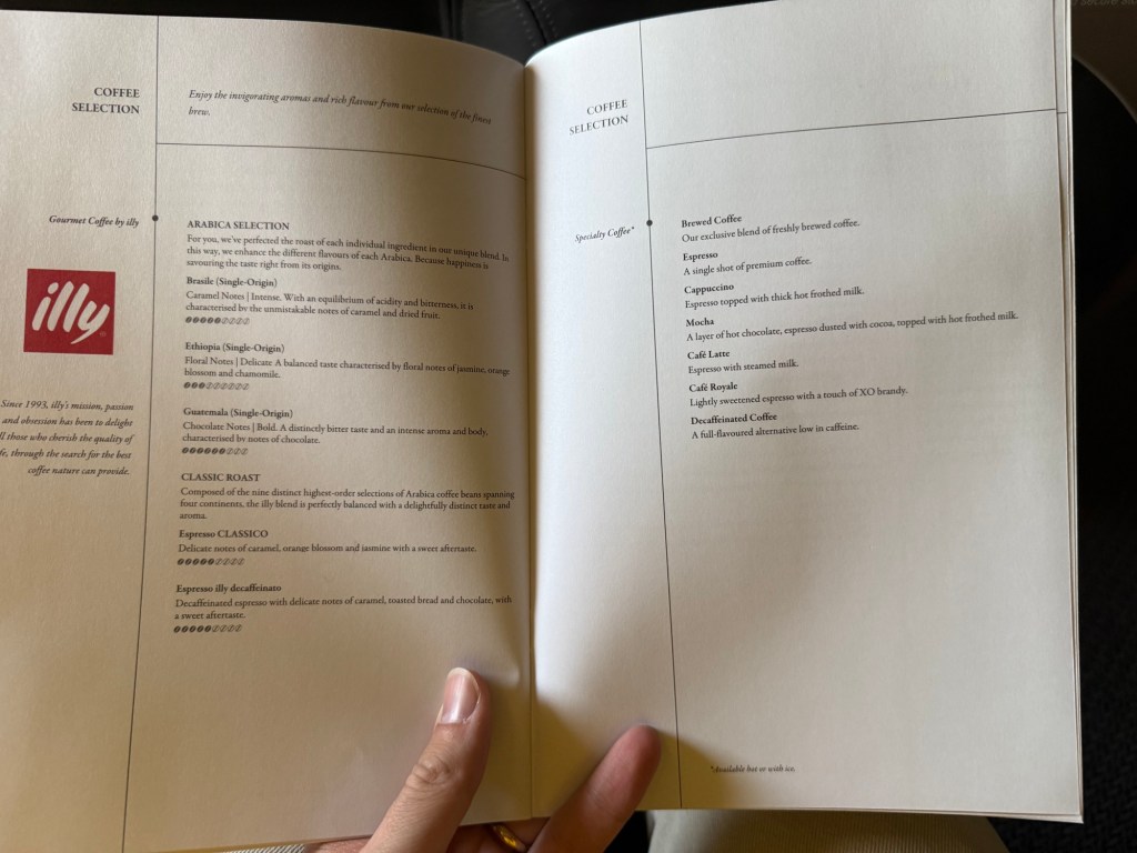 The menu also encompassed drinks, which features a lineup of several alcoholic and non-alcoholic options. For the alcoholic options, there were champagnes, wines, a decent selection of spirits, and beers. There were also a single cocktail and aperitif options. For non-alcoholic options, there was the usual selection of soft drinks, teas and coffees. The latter is in partnership with Illy. I’d say for that that like coffee, the selection appears very good, with a variety of Arabica and specialty coffees available. I liked that Singapore Airlines highlighted the strength of the coffee with coffee beans on a scale of 1 to 10.