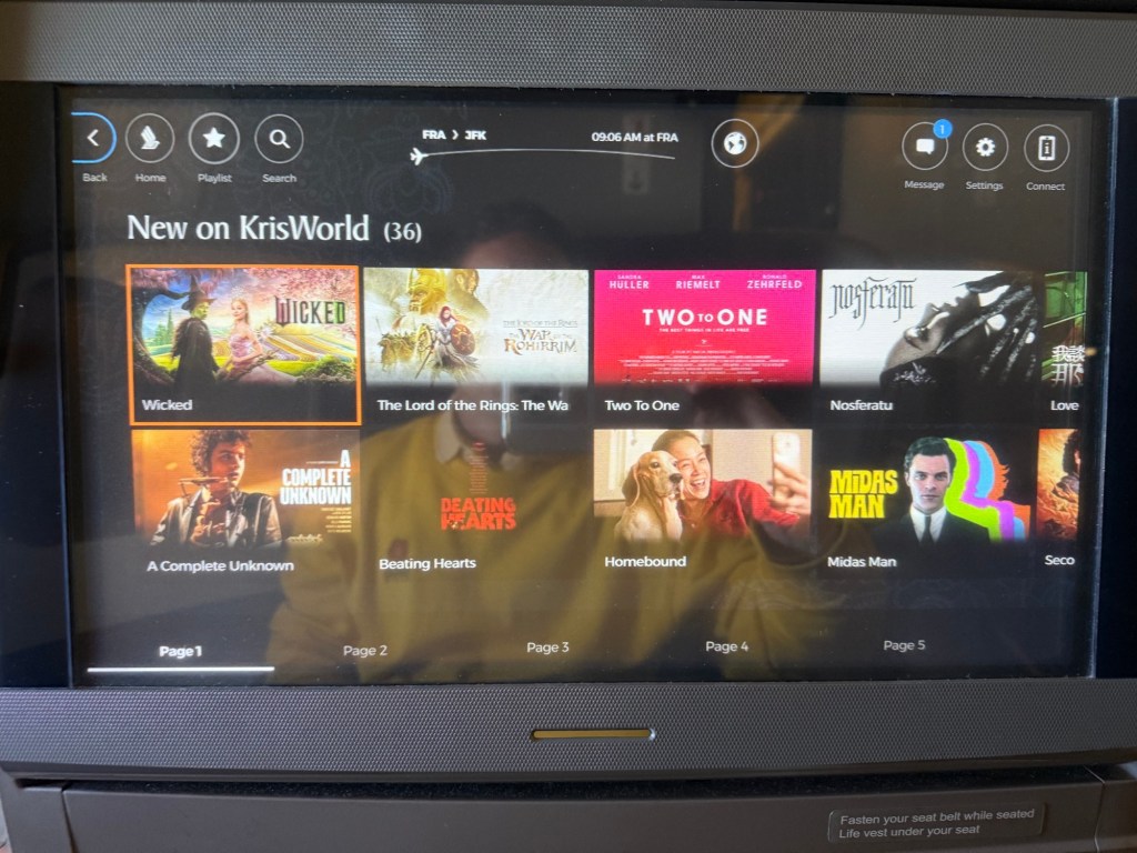 You’ll also notice on the top of the interface a variety of buttons. Most of these are self-explanatory, but the one all the way to the right intrigued me: this allows you to connect your own devices directly to the system, and going there gives you some info on your options. You can connect through the Singapore Airlines app, the in-flight WiFi, and the HDMI port in the seat. I had not connected anything though, so there wasn’t anything here besides information. I do like that Singapore Airlines gives you this option.